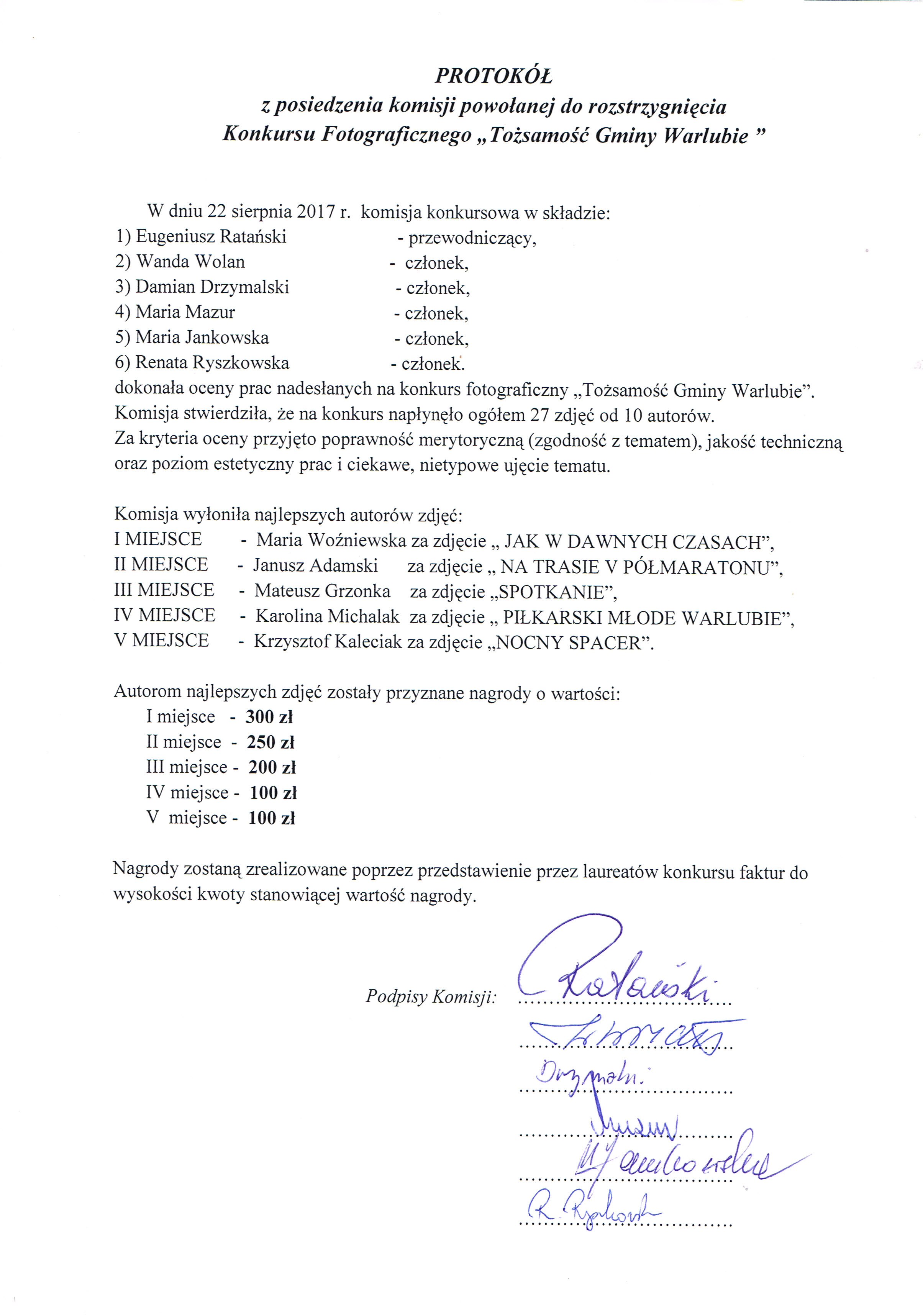 W dniu 22 sierpnia 2017r. Komisja Konkursowa dokonała oceny prac nadesłanych na konkurs fotograficzny. Z wynikami można zapoznać się w załączonym protokole. Gratulujemy laureatom oraz wszystkim uczestnikom, którzy wzięli udział. Zapraszamy do udziału w następnym roku.
